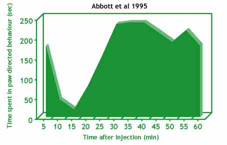 The time spent favouring, lifting and licking the injected paw increased to about 190 sec in the first five minutes and then decreased to about 20 seconds by 15 minutes after treatment. Times then rose gradually to reach a peak of about 250 sec between 30 and 40 minutes after treatment - decreasing to about 190 sec at 60 seconds after treatment. (Maximum value possible is 300 seconds in any 5 minute period) (Abbott et al 1995).