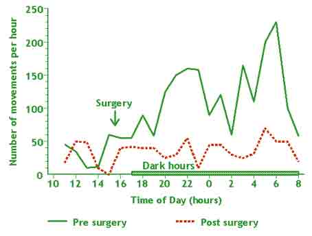 Surgery reduced the activity of the rats only during the dark hours. The number of movements per hour in surgically treated rats did not exceed 60 between 17.00h and 08.00h compared with values up to 230 in control rats.