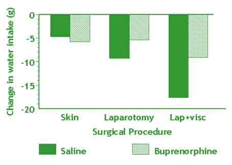 Increasing the severity of the surgical interference decreased water intake post surgery compared with pre-treatment intakes. This effect was only seen during the dark period when rats are most active. The use of an analgesic (buprenorphine) significantly reduced the magnitude of this effect.