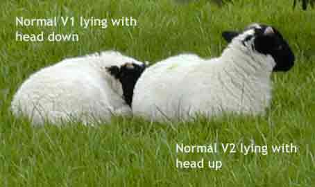 Picture of two Scottish Blackface lambs lying in a normal ventral (sternal) posture, one with the head up (V2) and one with the head down and round on the side (V1).