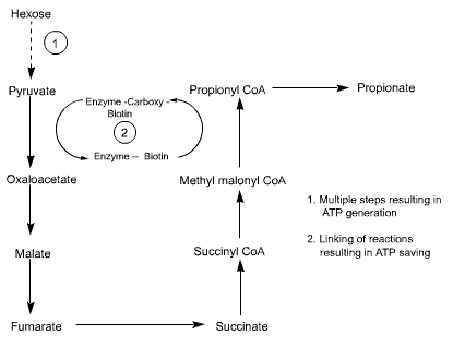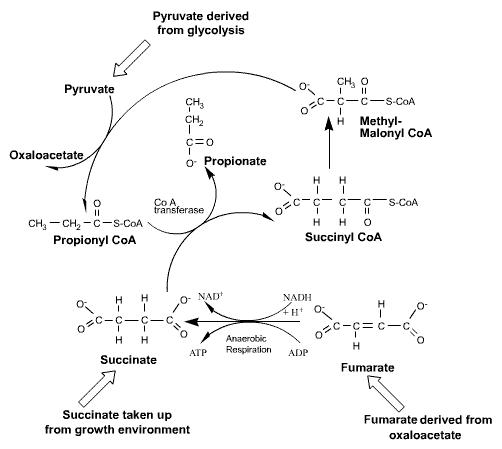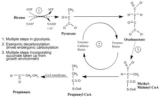 The overall pathway showing the production of propionate from hexose sugars is shown below.