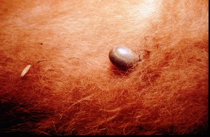 Ixodes ricinus fed femaleThis is a female Ixodes ricinus tick that is feeding on a cow. She will soon drop off the animal and lay her eggs . If the animal was infected with Babesia divergens then the parasite will undergo development in the tick before she drops off and the protozoan will pass to the eggs which will in turn give rise to Babesia-infected larval tick.When the the larval tick feeds it will pass on the infection to that host (transovarial transmission). The infected larva also retains the infection in its tissues so that the next stage in the life cycle (nymph) is also capable of transmitting the protozoan when it starts to feed (transtadial transmission). Similarly, the the adult stage also acquires an infection from the nymph and transmits the infection during feeding. See also |