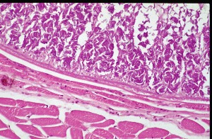 Section of sheep oesophagus infected with SarcocystisThis is a high power view of a section through a tissue cyst of Sarcocystis. This view shows the outer region of the cyst with groups of bradyzoites arranged around the supporting framework of the cyst.
