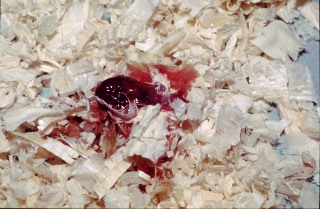 Blood-stained droppings from an acute Eimeria tenella infectionBlood-stained droppings are characteristic of acute E.tenella infection in chickens. The blood comes from the massive cellular destruction that is associated with the cycles of asexual reproduction that takes place early in infection (3-5 days after infection). |