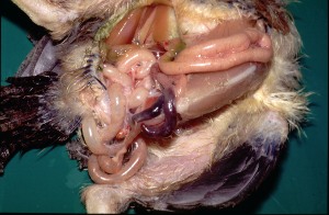 Acute Eimeria tenella infectionThis is the appearance of the gut of a chicken approximately 5 days after infection with a large number of infective oocysts of E.tenella. The caecae are distended and filled with blood due to the massive cell destruction resulting from the cycles of asexual reproduction (schizonts and merozoites). This form of the infection can lead to rapid mortality often characterised with bloody diarrhoea.