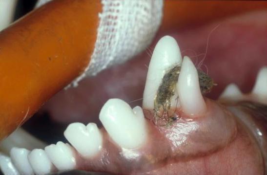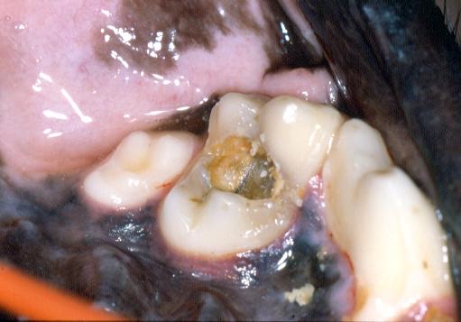 Teeth ruined by advanced caries, feline neck lesions etc.